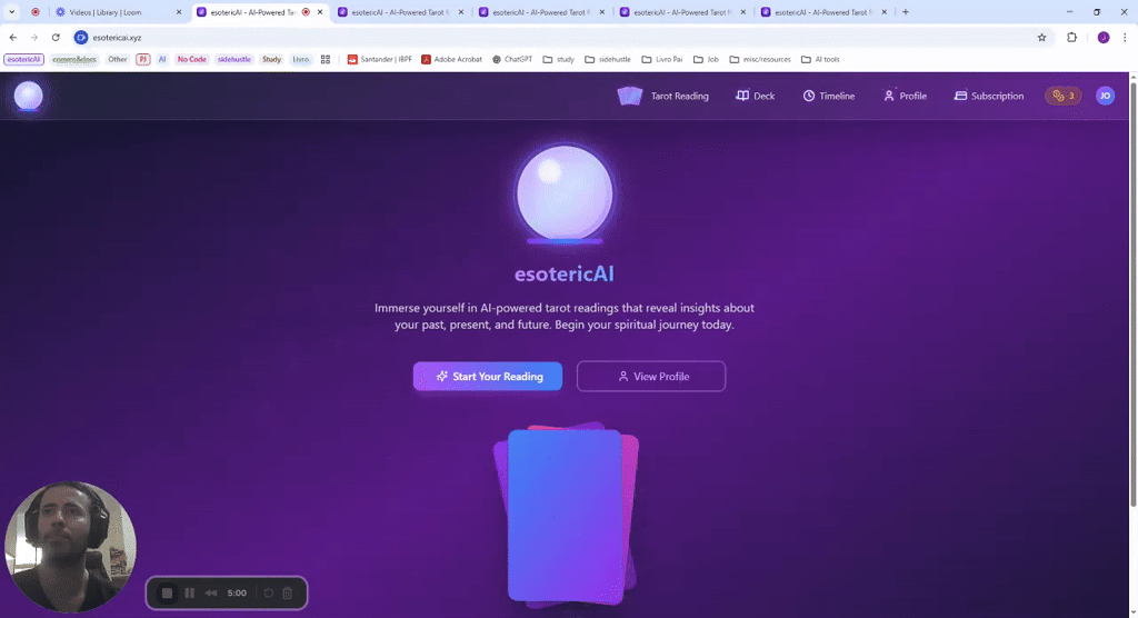 Descrição da ferramenta: Plataforma de leituras de tarô e diário impulsionados por inteligência artificial, com recursos gamificados para acompanhar o crescimento pessoal, oferecendo insights personalizados e sistema de recompensas por indicações.