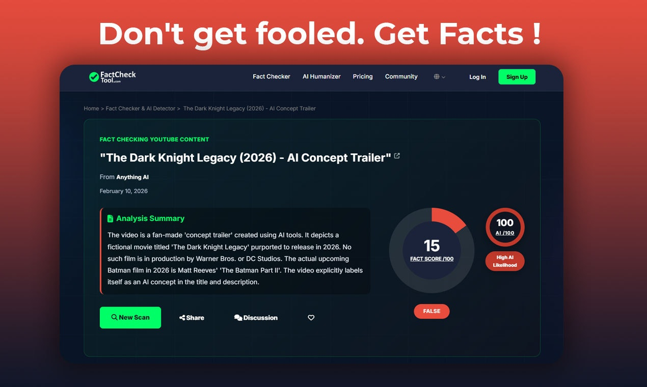 Descrição da ferramenta: FactCheckTool.com é uma plataforma que verifica a veracidade de conteúdos em redes sociais, extraindo informações de links, analisando fontes, detectando viés e geração por IA, e fornecendo uma avaliação detalhada da credibilidade do conteúdo.