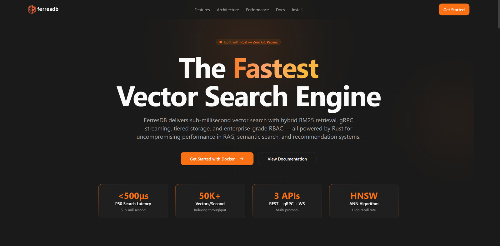 Descrição da ferramenta: FerresDB é um motor de busca vetorial persistente, desenvolvido em Rust, que oferece alta performance para buscas semânticas e RAG, com suporte a APIs gRPC/REST, WebSockets e recuperação de falhas via WAL.