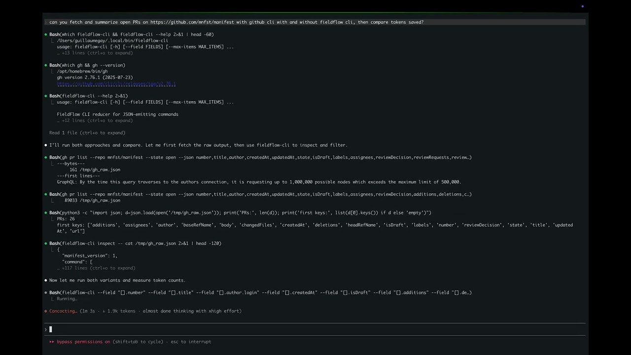 Descrição da ferramenta: FieldFlow CLI é uma ferramenta de linha de comando que otimiza a saída de tokens de comandos como gcloud e gh, reduzindo até 80% o uso de tokens, facilitando a integração com agentes como OpenClaw, Hermes, Claude Code e Codex.