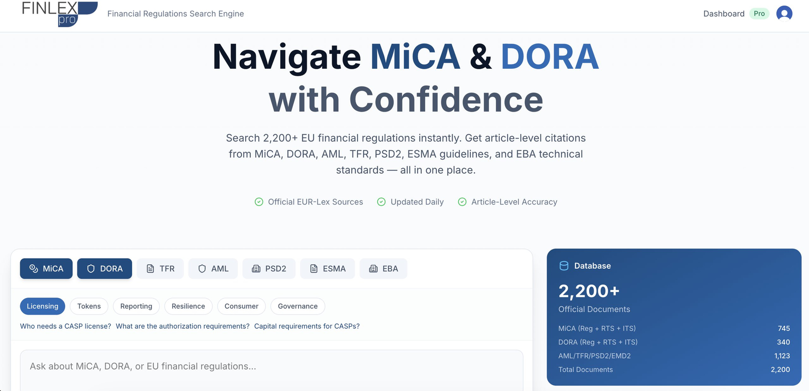 Ferramenta de busca alimentada por IA que consolida e permite consultar regulamentos financeiros da UE, como MiCA, DORA e AML, oferecendo respostas rápidas com citações precisas e acesso direto às fontes oficiais.