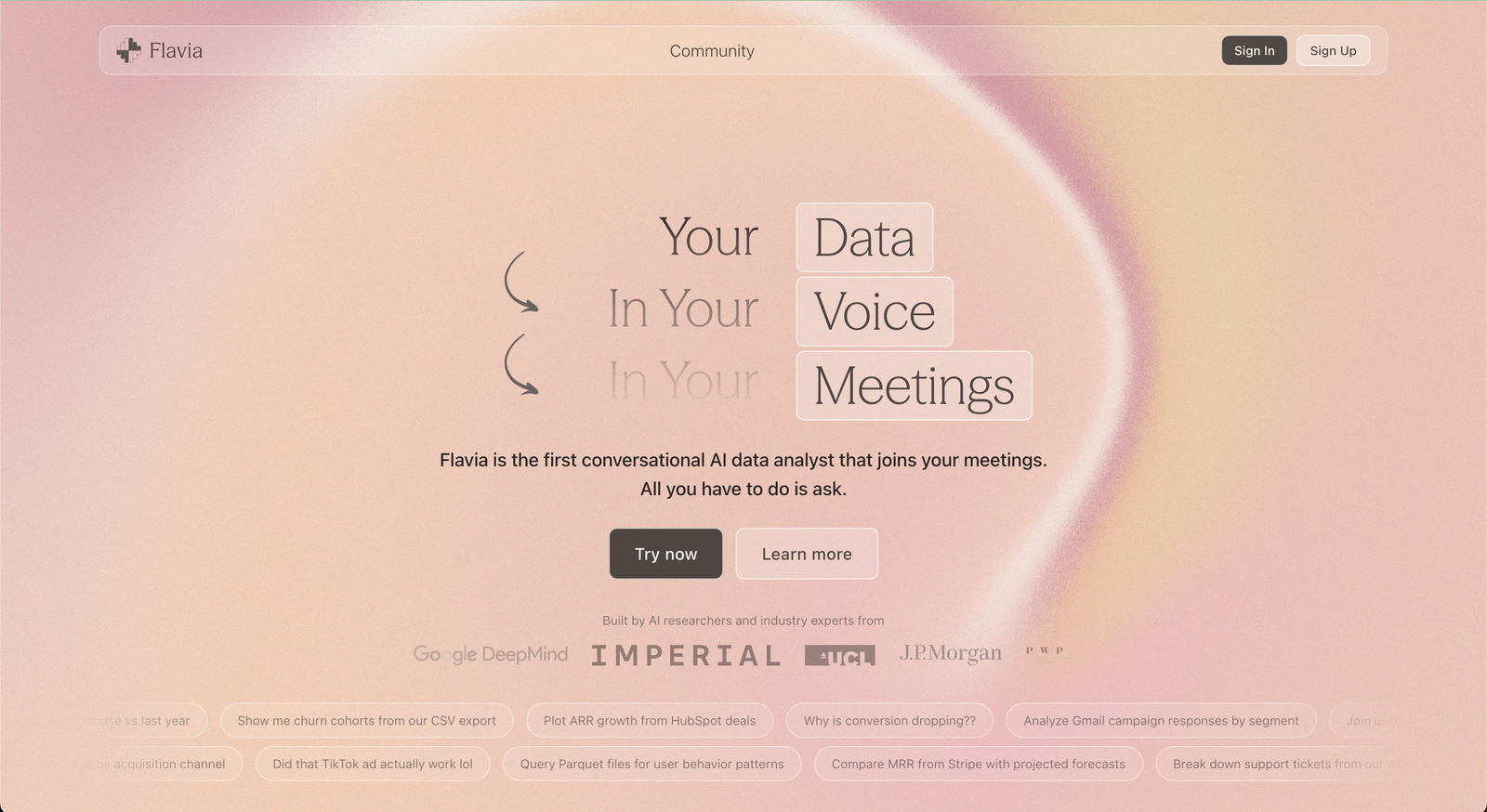 Descrição da ferramenta: Flavia é uma analista de dados com inteligência artificial que participa de reuniões, permitindo interações por voz para perguntas e análises instantâneas, compartilhando sua tela para facilitar a compreensão dos dados em tempo real.