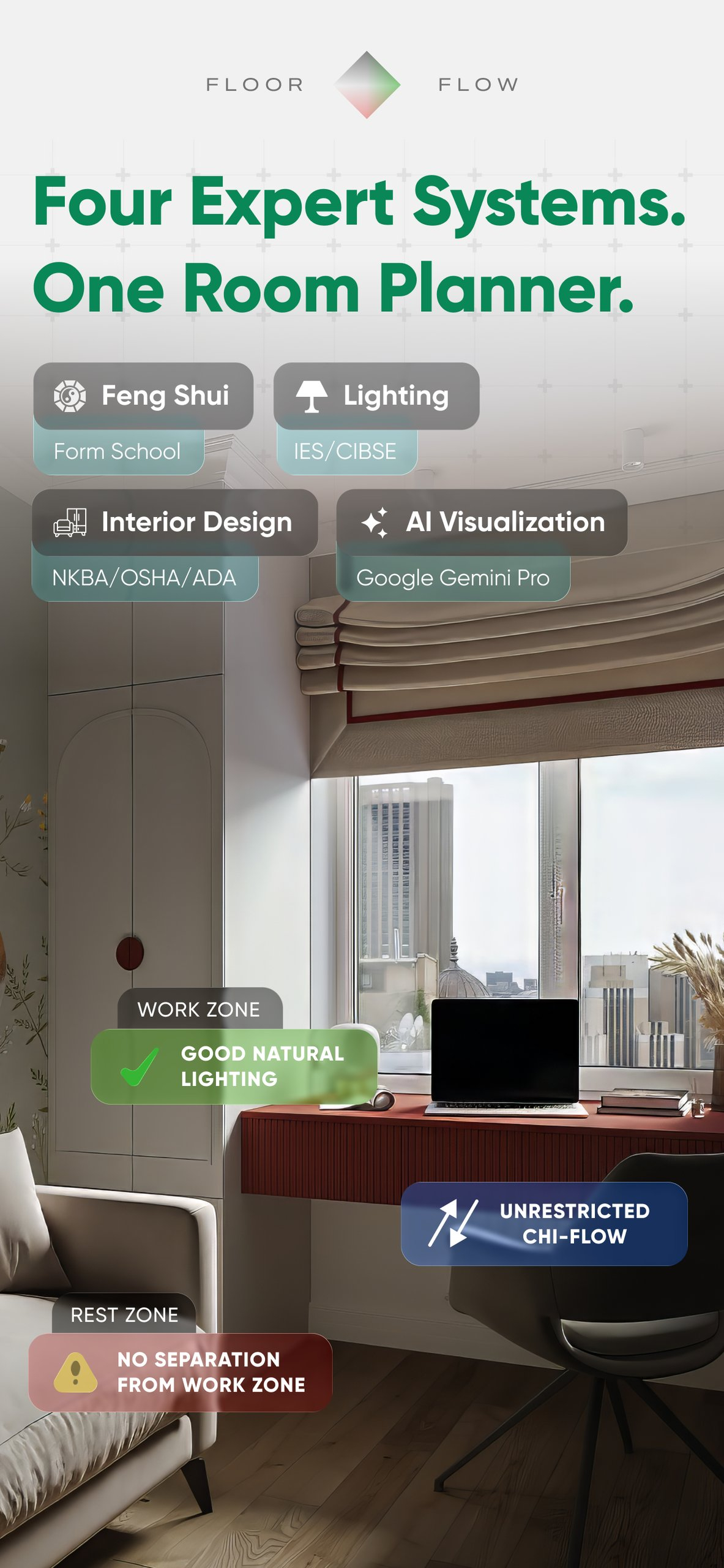 Descrição da ferramenta: FloorFlow é um planejador de ambientes 2D para iOS que avalia a funcionalidade do espaço, considerando Feng Shui, iluminação, padrões de design e visualização AI, oferecendo análises em tempo real com recomendações específicas.