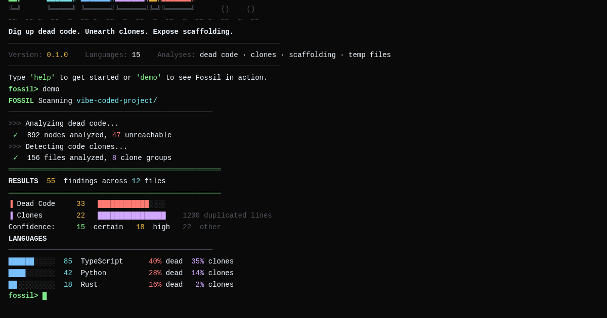 Descrição da ferramenta: Fossil MCP é uma ferramenta de análise de código que identifica funções mortas e lógica duplicada em projetos, utilizando análise de gráfico de chamadas em 15 linguagens, facilitando a manutenção e limpeza do código-fonte.