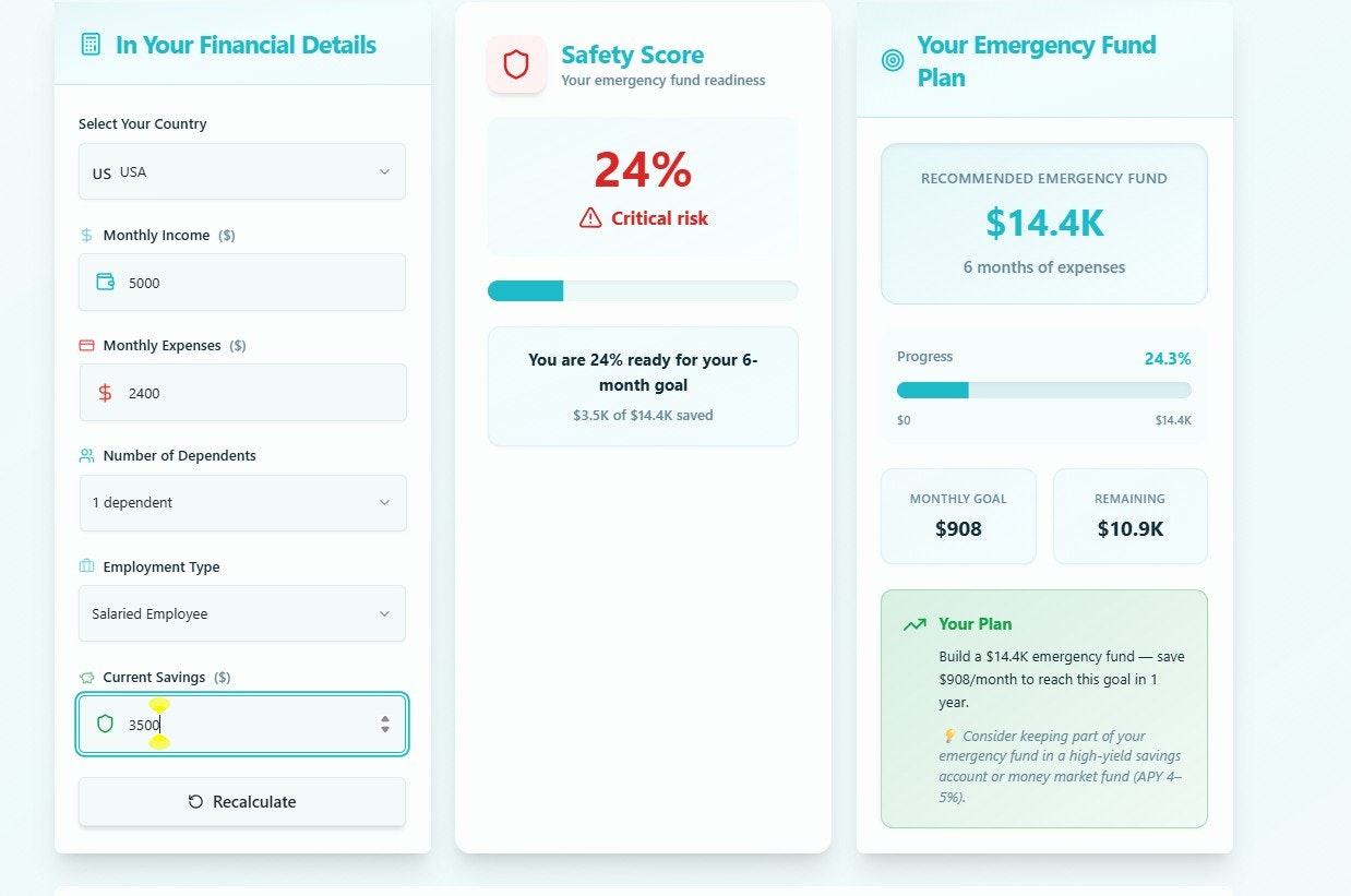Descrição da ferramenta: Emergency Fund Calc é uma ferramenta que calcula rapidamente o valor ideal de reserva financeira, avalia sua segurança nas economias e fornece insights para aprimorar sua preparação financeira.