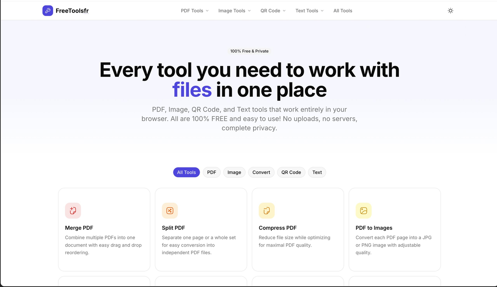 Descrição da ferramenta: FreeToolsfr oferece uma variedade de ferramentas online gratuitas para edição de PDFs, conversão de imagens, geração de códigos QR e processamento de textos, garantindo privacidade e segurança ao realizar todas as operações diretamente no navegador, sem necessidade de cadastro.