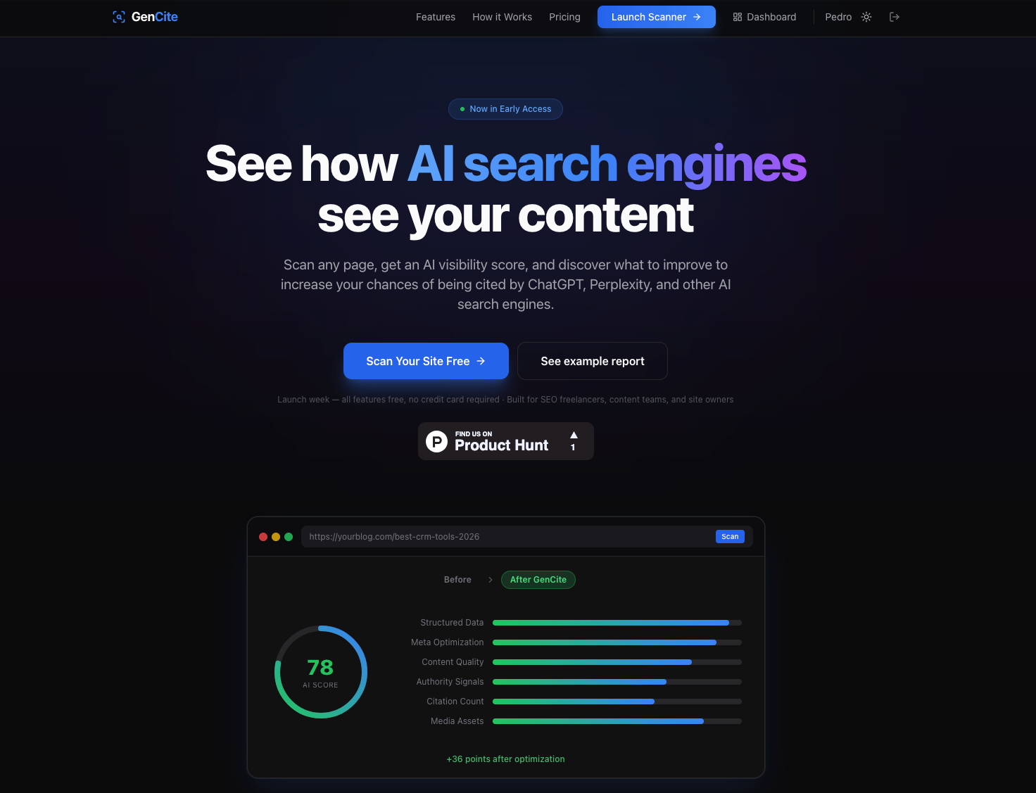 GenCite é uma ferramenta que avalia a visibilidade de conteúdo na IA, analisando URLs e fornecendo pontuações baseadas em 13 fatores para otimizar a citação por ChatGPT, Perplexity e Gemini.