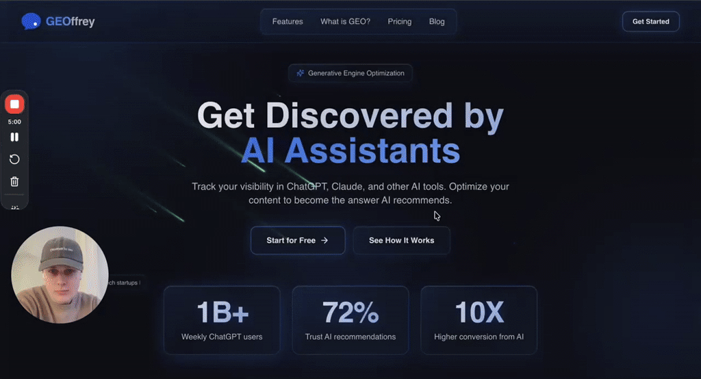 Descrição da ferramenta: GEOffrey é uma plataforma que otimiza sites para serem reconhecidos por ferramentas de IA, identificando prompts relevantes e fornecendo conteúdo direcionado para aumentar leads inbound, além de oferecer auditorias rápidas de melhorias no site.