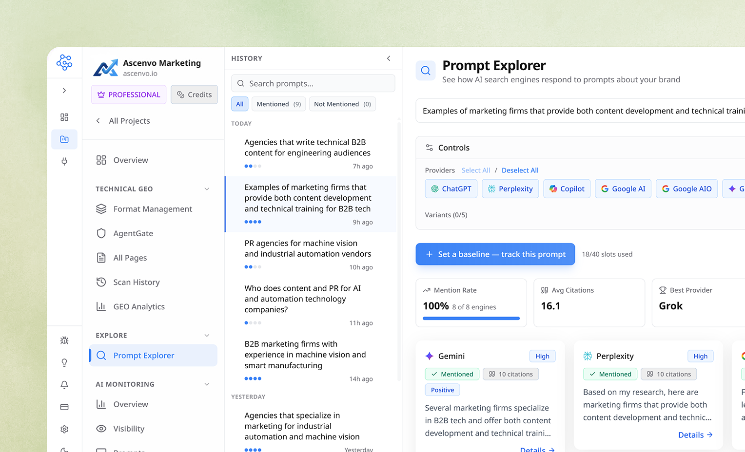 📈 Tendências de visibilidade: Visualiza mudanças ao longo do tempo na presença da marca na IA.