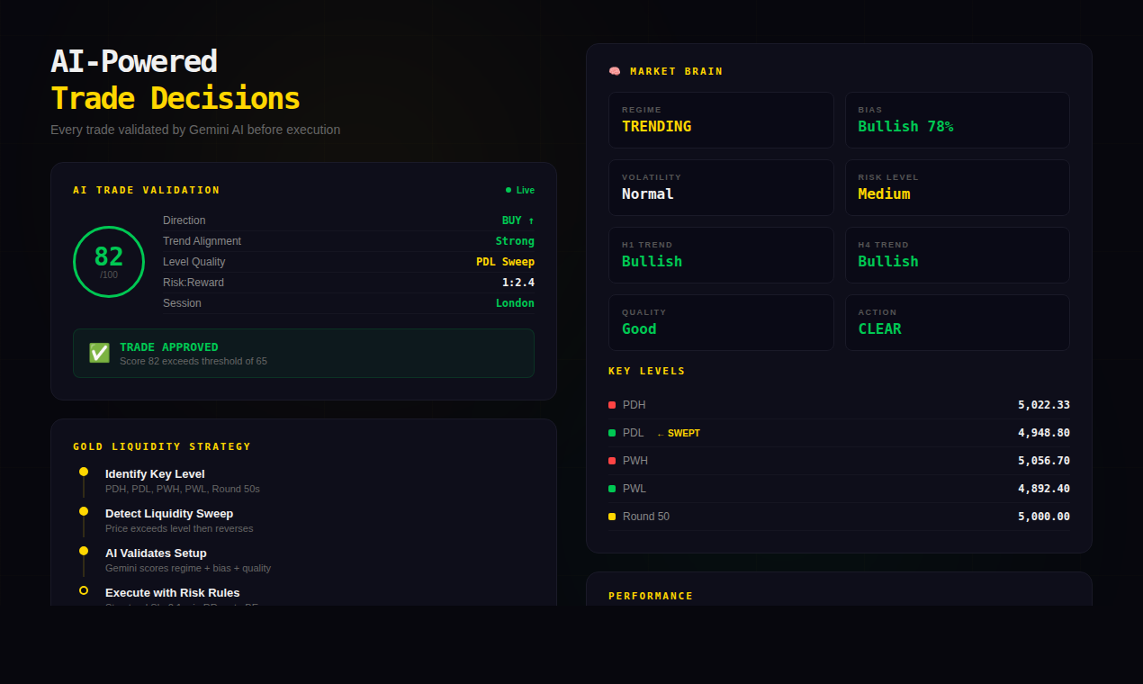 Descrição da ferramenta: GoldMind AI é um bot de inteligência artificial que realiza operações de compra e venda de ouro na plataforma MT5, detectando movimentos de liquidez, avaliando cada operação e gerenciando riscos automaticamente, com otimização contínua e painel ao vivo.