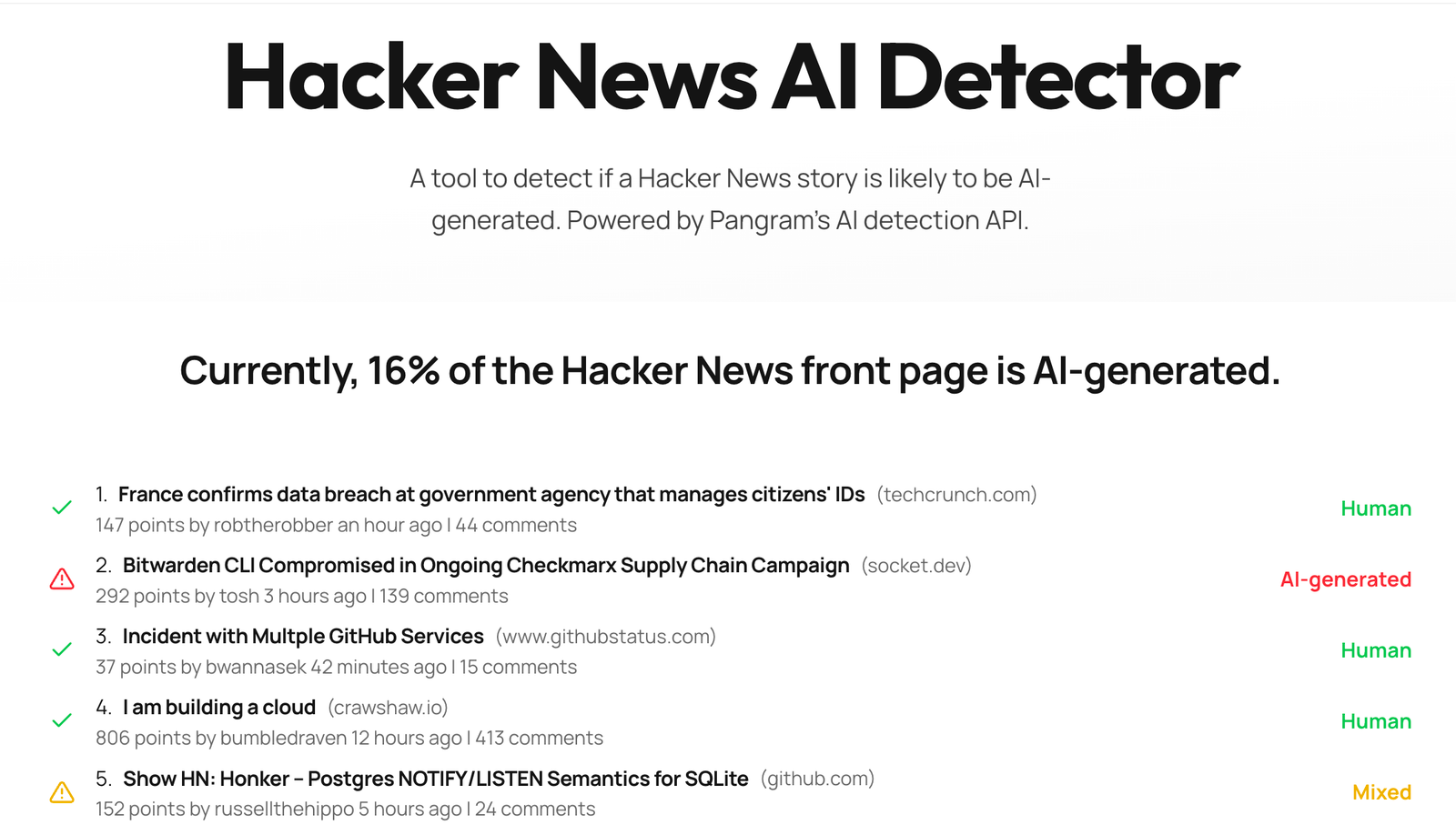Descrição da ferramenta: Hacker News AI Detector é uma ferramenta que identifica se uma história do Hacker News foi gerada por inteligência artificial, utilizando a API de detecção de IA da Pangram para análise precisa e eficiente.