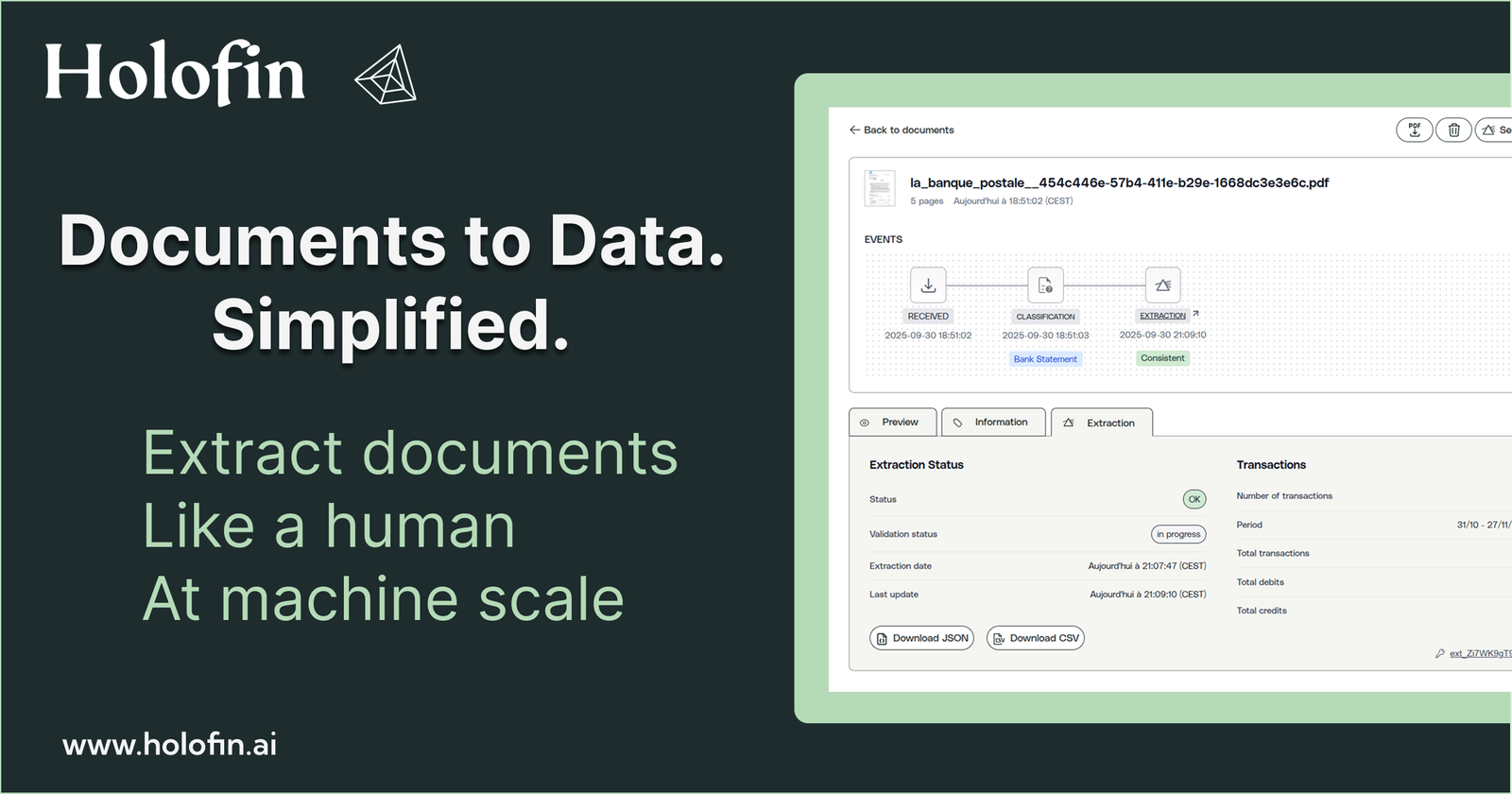 Descrição da ferramenta: Holofin é uma plataforma que extrai dados estruturados de documentos diversos, como extratos bancários, faturas e registros médicos, com alta precisão, facilitando a análise e validação automática sem necessidade de templates ou regras.