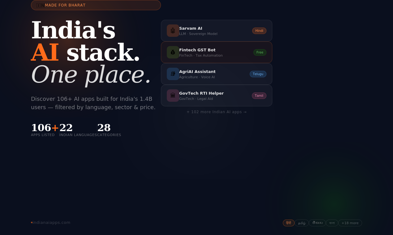 Descrição da ferramenta: Diretório curado de aplicativos de IA na Índia, que reúne ferramentas específicas para o contexto indiano, incluindo LLMs, automações financeiras, agricultura e assistentes em múltiplas línguas regionais.