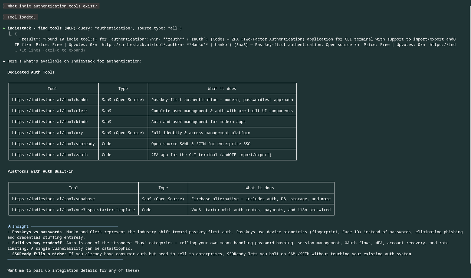 Descrição da ferramenta: IndieStack é uma plataforma que reconstrói autenticação, pagamentos e análises a partir de criações existentes no GitHub, facilitando a descoberta e reutilização de recursos por inteligências artificiais e desenvolvedores independentes.