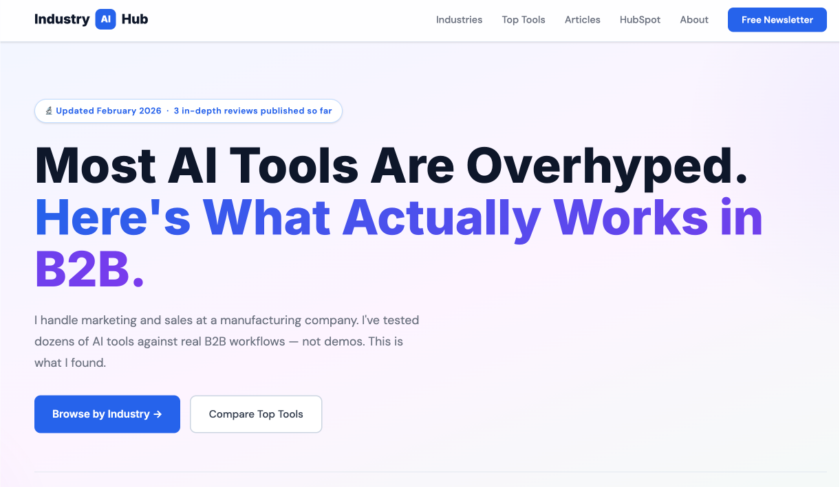Descrição da ferramenta: Industry AI Hub é uma plataforma que oferece avaliações confiáveis de ferramentas de inteligência artificial voltadas para equipes B2B e industriais, testadas por um profissional do setor em fluxos de trabalho reais no HubSpot e marketing industrial.