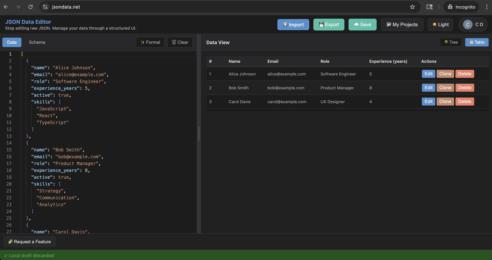 Descrição da ferramenta: JSON Data Manager é uma plataforma que converte esquemas JSON complexos em uma interface de entrada de dados estruturada, facilitando a edição segura e eficiente sem riscos de erros sintáticos.