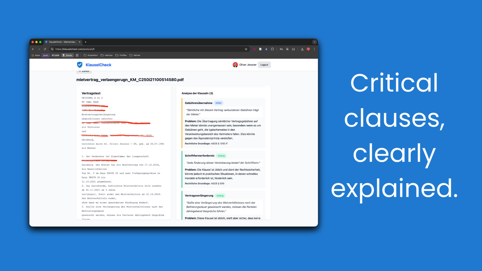 Descrição da ferramenta: KlauselCheck é uma ferramenta que analisa contratos de aluguel, destacando cláusulas críticas, riscos e formulações incomuns, oferecendo explicações claras e acessíveis para facilitar a compreensão rápida do documento.
