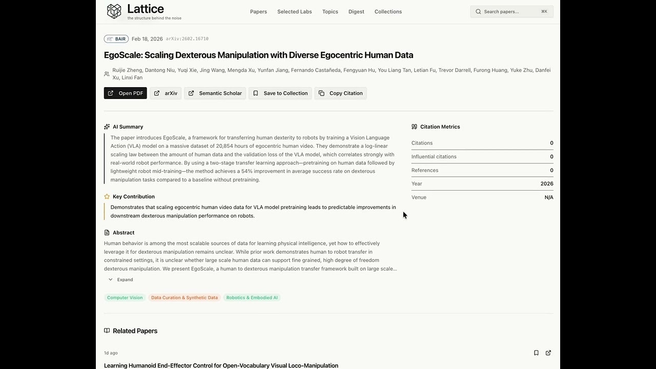 Descrição da ferramenta: Lattice monitora publicações de laboratórios de IA em 24 tópicos, oferecendo resumos, correspondência de afiliações e análise de tendências, com visualizações acessíveis e sem necessidade de cadastro ou pagamento.
