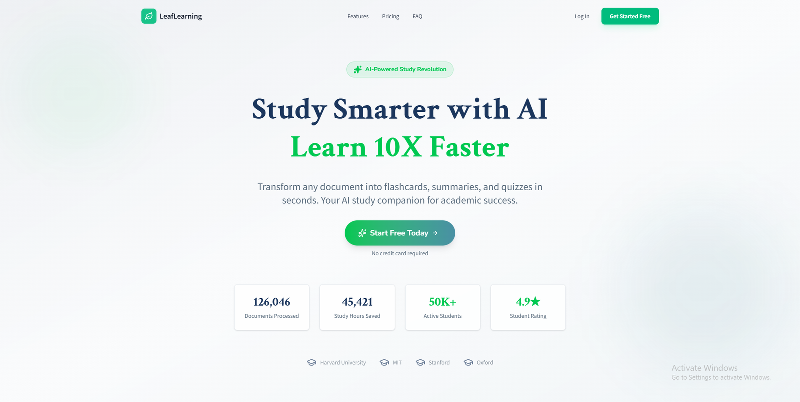 Descrição da ferramenta: LeafLearning é uma plataforma que utiliza inteligência artificial para transformar documentos, PDFs e notas em resumos, flashcards, questionários e planos de estudo personalizados, facilitando o aprendizado eficiente e organizado.
