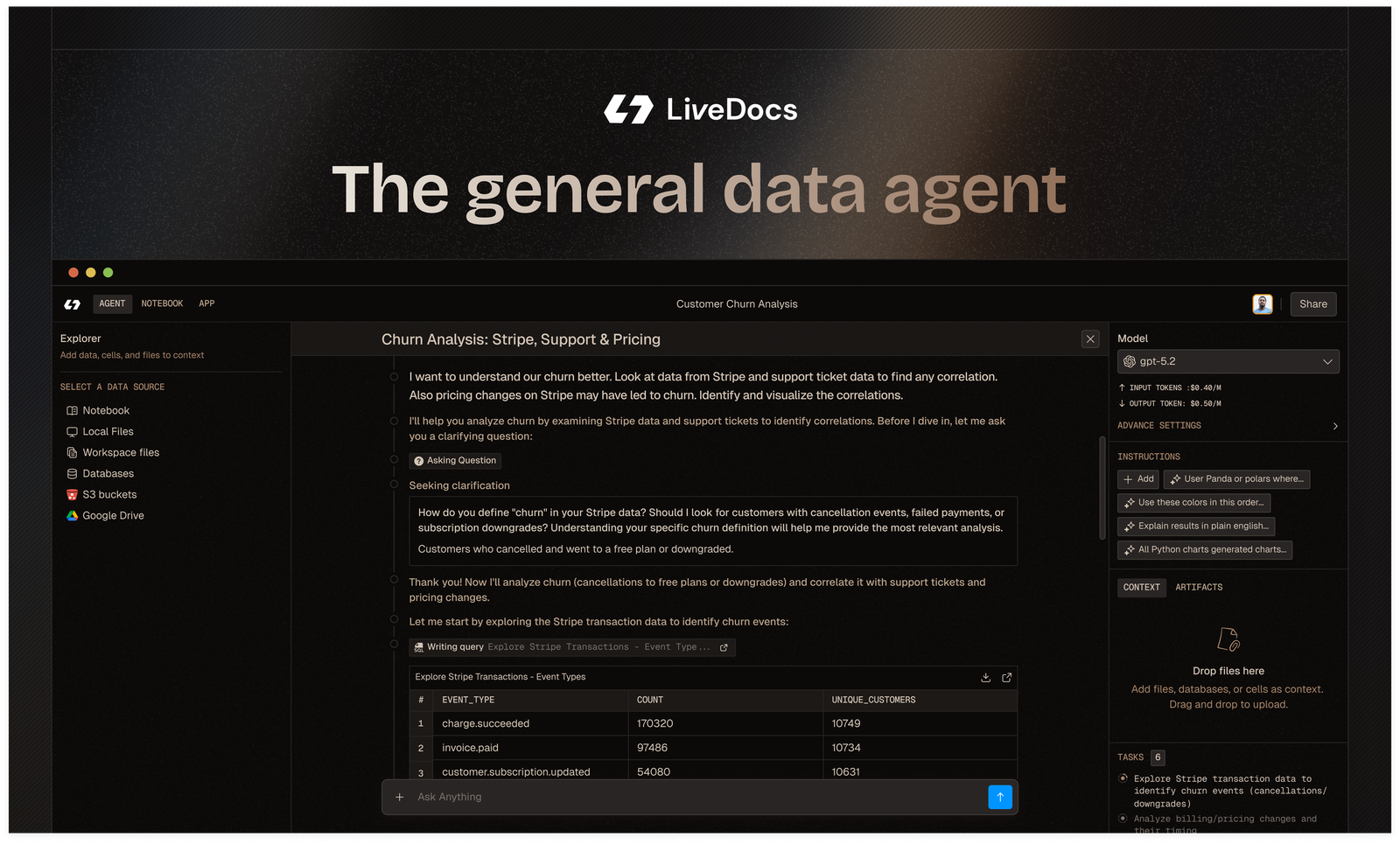 Descrição da ferramenta: Livedocs é um agente de dados que realiza BI, ML, criação de dashboards e geração de códigos, facilitando análises rápidas e acessíveis sem necessidade de configuração ou conhecimentos avançados em SQL.