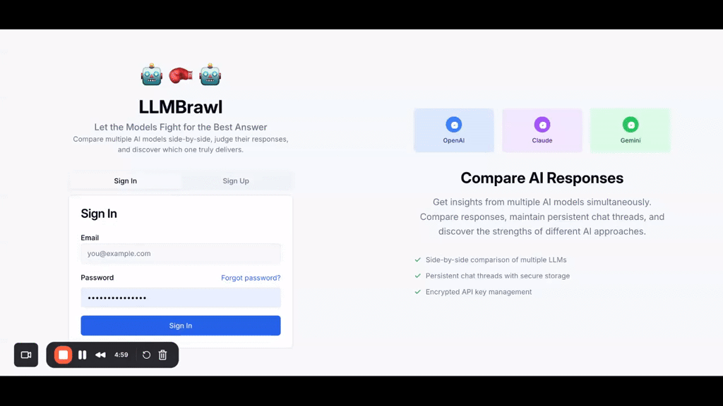 Descrição da ferramenta: LLMBrawl permite comparar múltiplos modelos de IA simultaneamente, avaliando suas respostas em um ambiente seguro e transparente, facilitando a análise de desempenho e insights sobre diferentes abordagens de inteligência artificial.