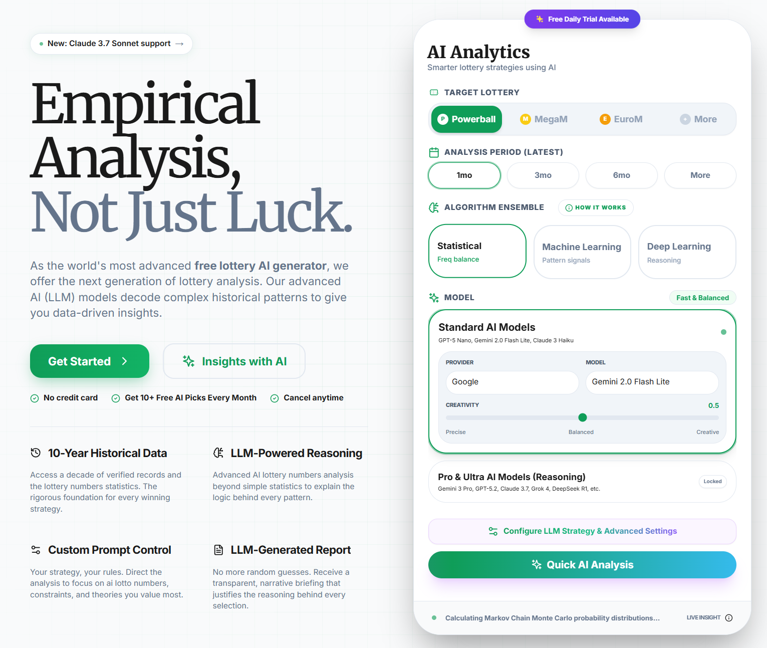 📊 Dados Históricos: Baseia-se em uma década de resultados de loterias para gerar insights precisos.