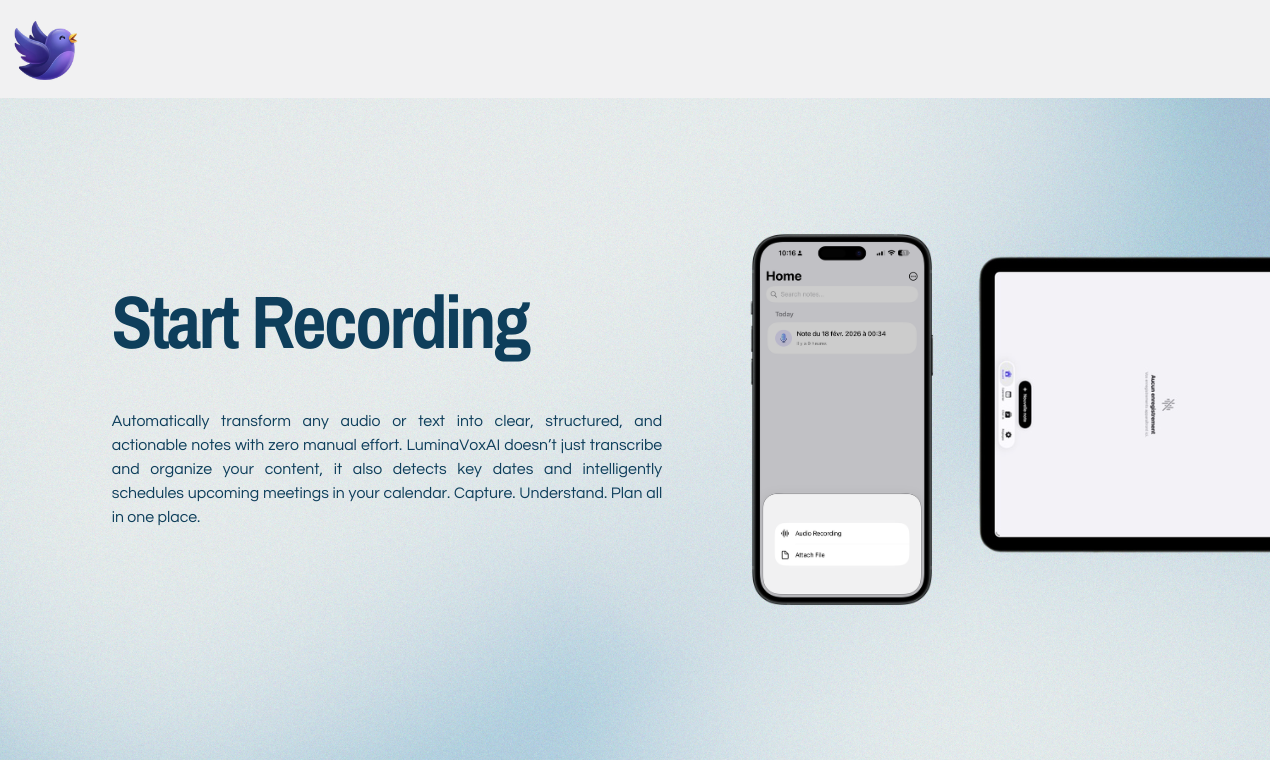 Descrição da ferramenta: LuminaVoxAI converte gravações de áudio em transcrições, resumos e flashcards, além de identificar datas e tarefas. Ela automatiza o agendamento de reuniões futuras, otimizando a gestão do tempo e a produtividade.