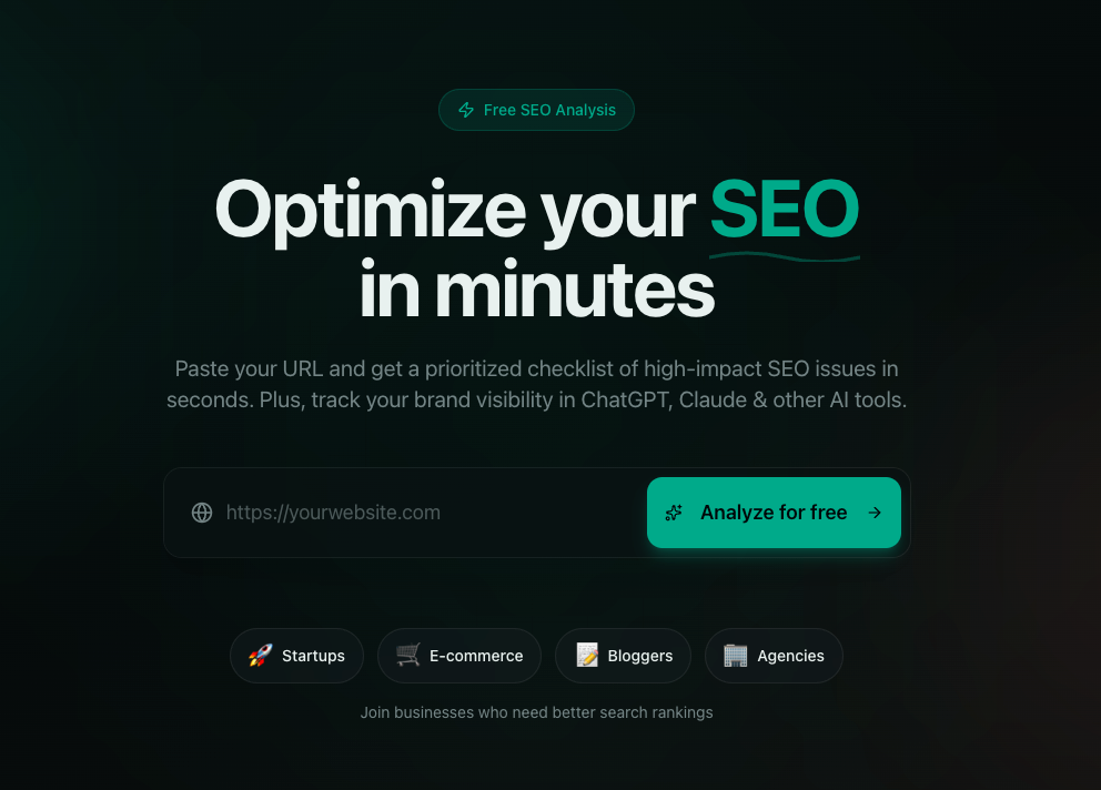 Descrição da ferramenta: Lumio SEO é uma ferramenta de análise de páginas web alimentada por inteligência artificial, que identifica problemas de SEO e Core Web Vitals em menos de 60 segundos, oferecendo recomendações práticas para melhorar o posicionamento nos motores de busca.
