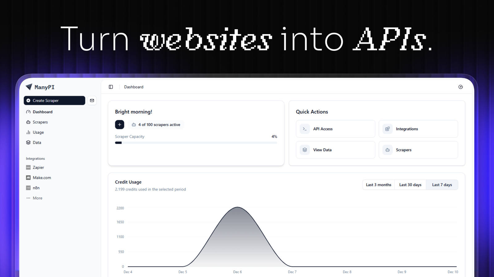 ManyPI converte qualquer website em uma API segura e estruturada, permitindo extração de dados via comandos em linguagem natural ou JSON-schema, facilitando integrações para pesquisa, vendas e agregação de conteúdo.