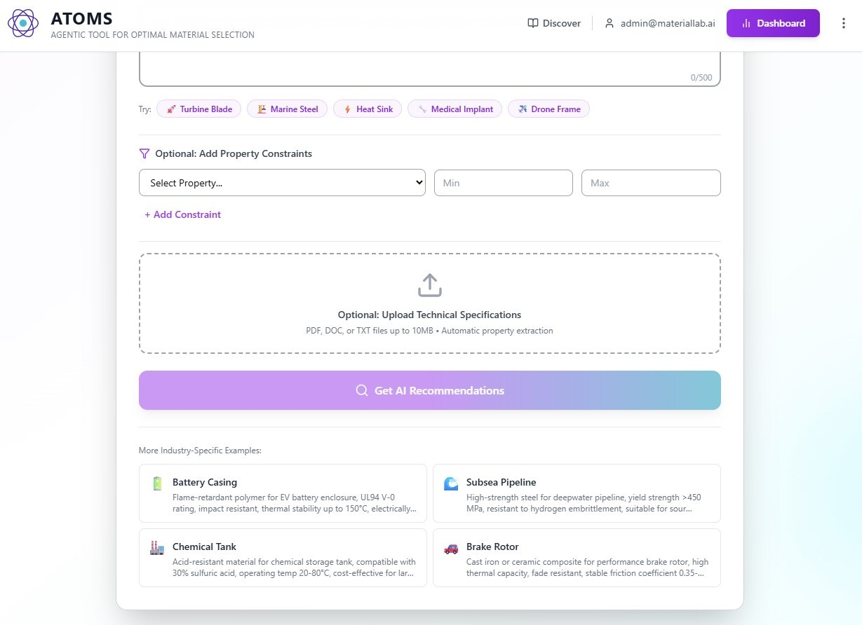 Descrição da ferramenta: Material Lab é uma plataforma que permite a pesquisa rápida e precisa de materiais para projetos de engenharia, oferecendo recomendações classificadas, análise de trade-offs e informações detalhadas sobre propriedades, custos e fornecedores em poucos segundos.