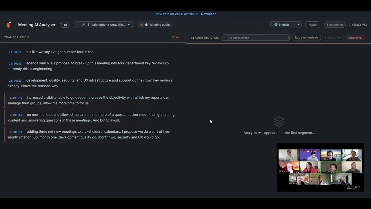 Descrição da ferramenta: Meeting AI Analyser é uma ferramenta de transcrição de reuniões local para Windows, que captura áudio em tempo real, transcreve com Whisper e gera resumos estruturados usando Claude AI, sem precisar de bots ou conexão com servidores externos.