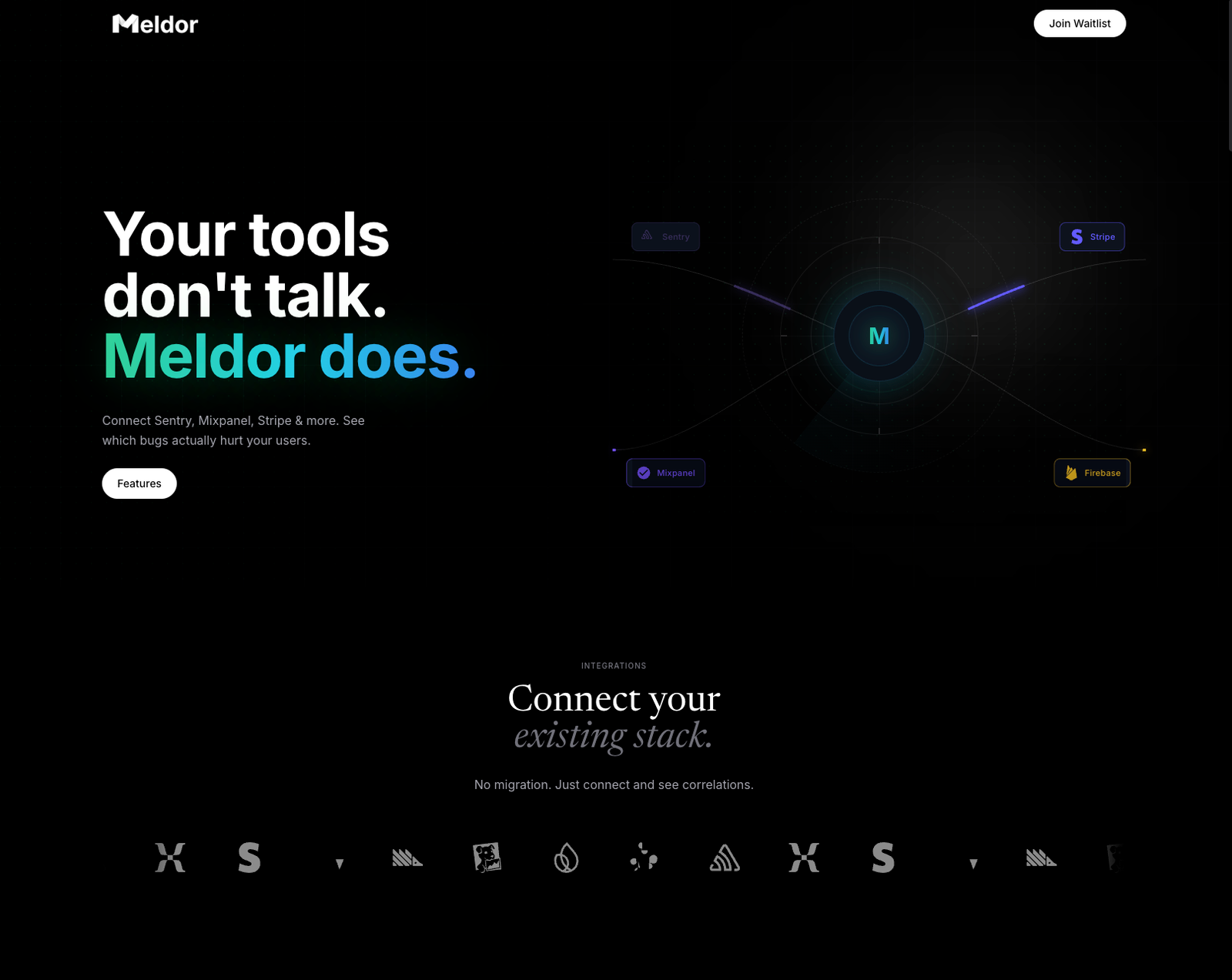 Descrição da ferramenta: Meldor integra Sentry, Mixpanel e Stripe em uma única linha do tempo, facilitando a identificação de erros, problemas de UX e impacto financeiro. A ferramenta fornece uma visão consolidada para priorizar correções que otimizam métricas essenciais do produto.