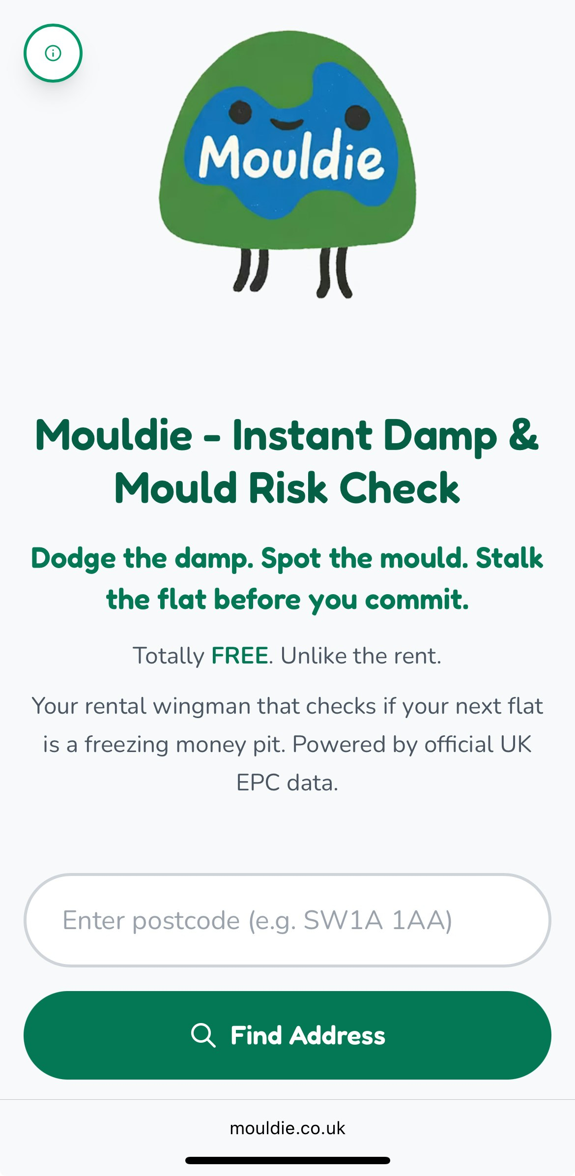 Descrição da ferramenta: Mouldie é uma ferramenta gratuita que avalia o risco de umidade e mofo em imóveis, utilizando dados oficiais para ajudar inquilinos a evitar casas insalubres, com altos custos de aquecimento ou problemas de isolamento.