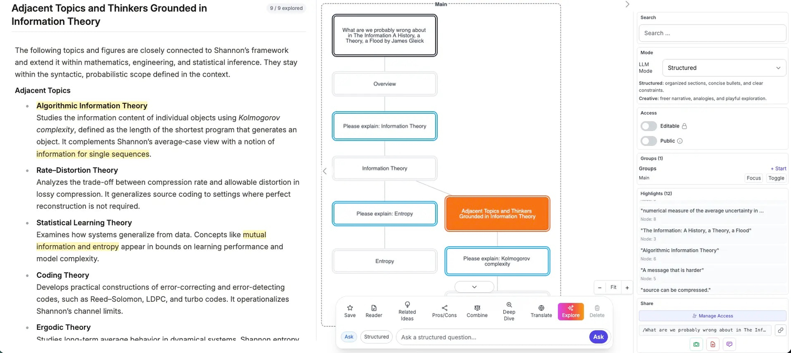 MuDG converte conversas lineares e desorganizadas em mapas visuais interativos, facilitando a exploração de tópicos complexos, promovendo o raciocínio colaborativo e a construção de uma base de conhecimento dinâmica.