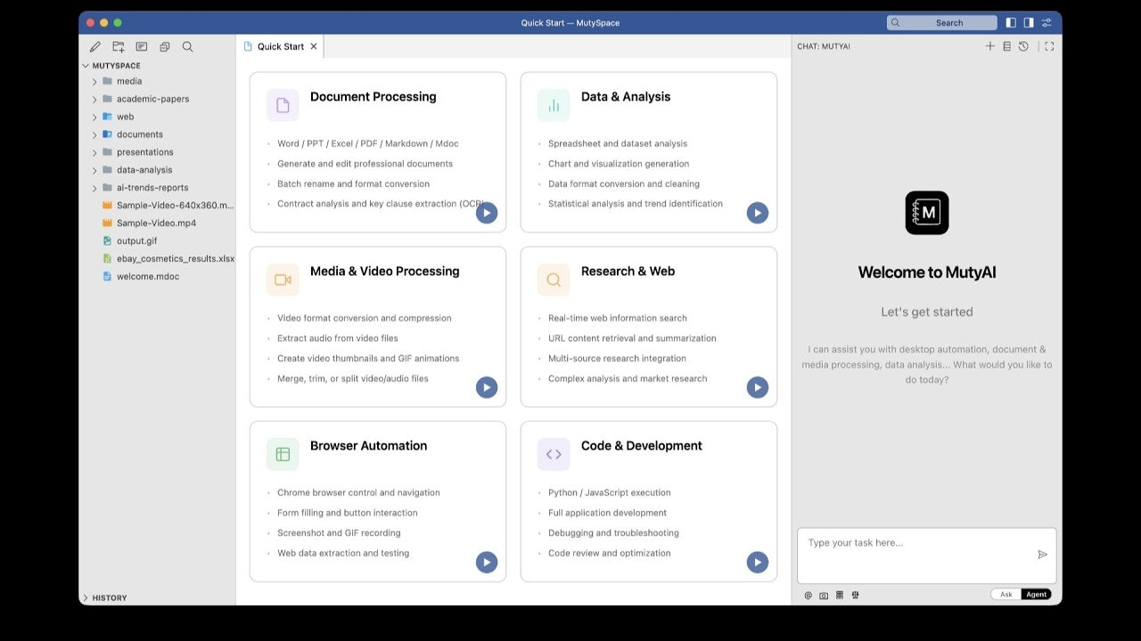 Descrição da ferramenta: MutyWork é uma plataforma que integra execução de tarefas com IA, edição de documentos Office e notas estilo Obsidian, tudo localmente. Oferece um ambiente unificado para gerenciar conhecimento e automatizar processos sem sair do aplicativo.