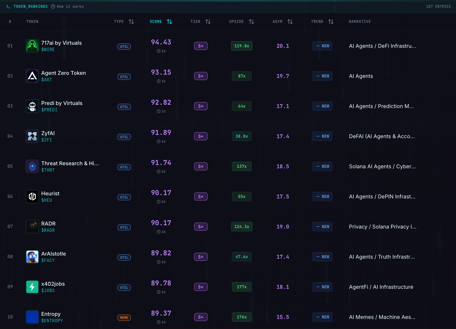 ⚖️ Pontuação por Desempenho: Classifica tokens usando pontuações recentes, potencial de valorização e assimetria de risco-retorno.