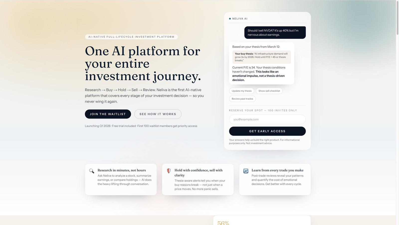 Descrição da ferramenta: Neliva é uma plataforma de investimento baseada em inteligência artificial que acompanha todo o ciclo de decisões financeiras, desde pesquisa até revisão, facilitando análises precisas e estratégias automatizadas.