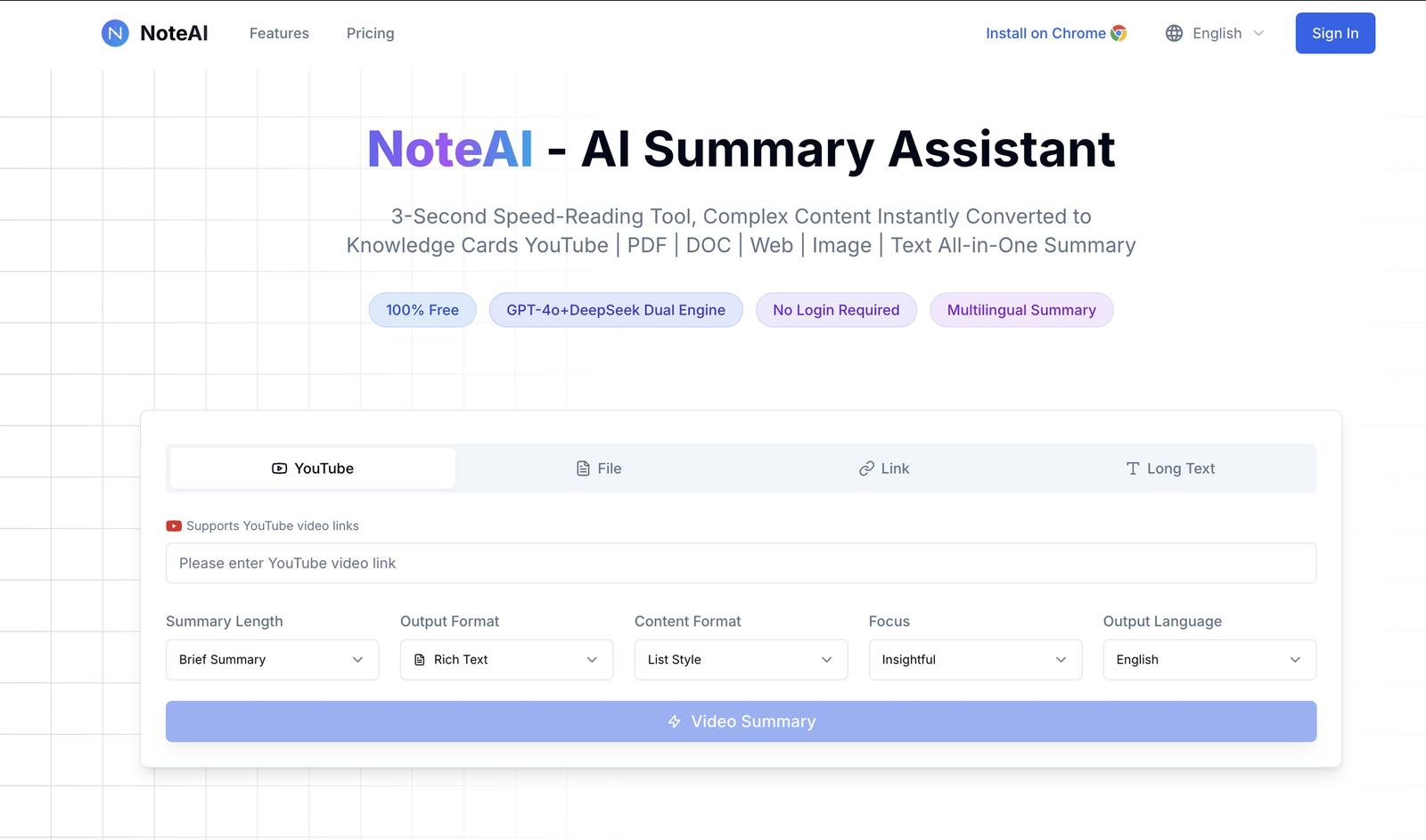 Descrição da ferramenta: NoteAI – AI Summary Assistant é uma ferramenta que gera resumos automáticos de vídeos, documentos, sites, PDFs e imagens, utilizando inteligência artificial avançada para facilitar a compreensão rápida de conteúdos diversos em múltiplos idiomas.