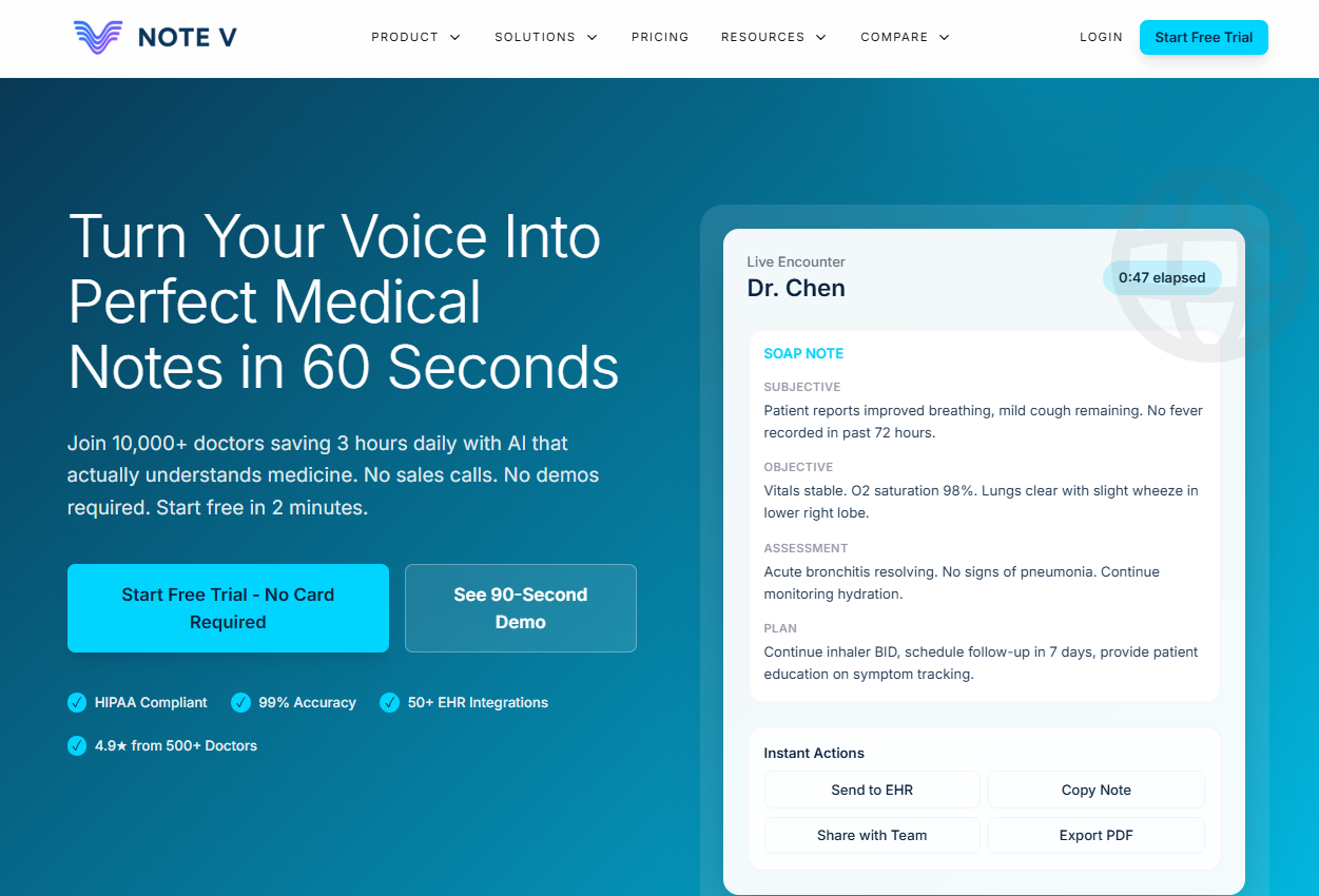 Descrição da ferramenta: NoteV é uma plataforma de automação de documentação médica que converte voz em notas precisas em até 60 segundos, garantindo conformidade com HIPAA e integração com mais de 50 sistemas EHR.
