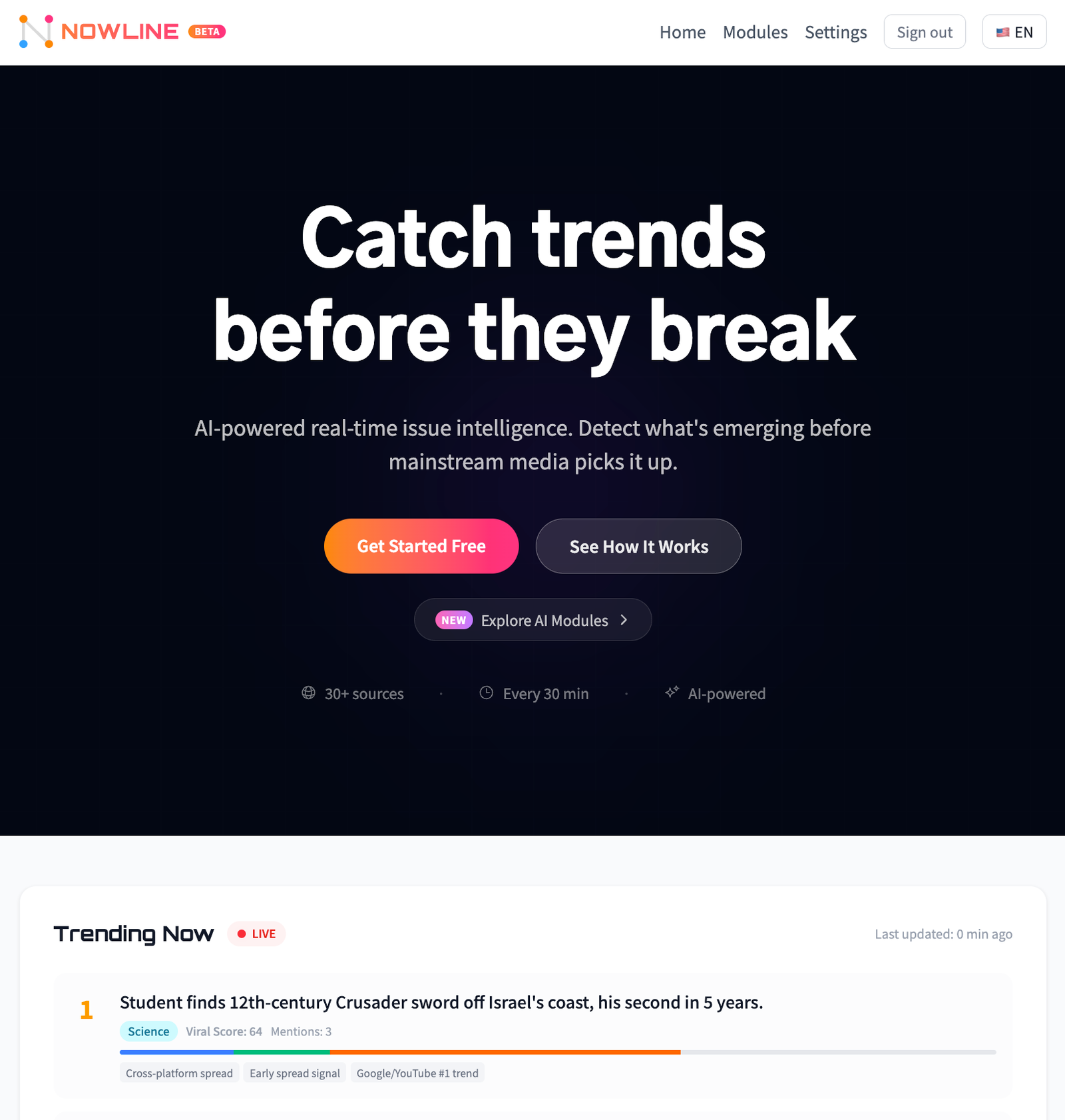 Descrição da ferramenta: Nowline é uma ferramenta de monitoramento de tendências que identifica assuntos virais antes de se tornarem populares, utilizando inteligência artificial e múltiplas fontes, entregando informações em tempo real via RSS.