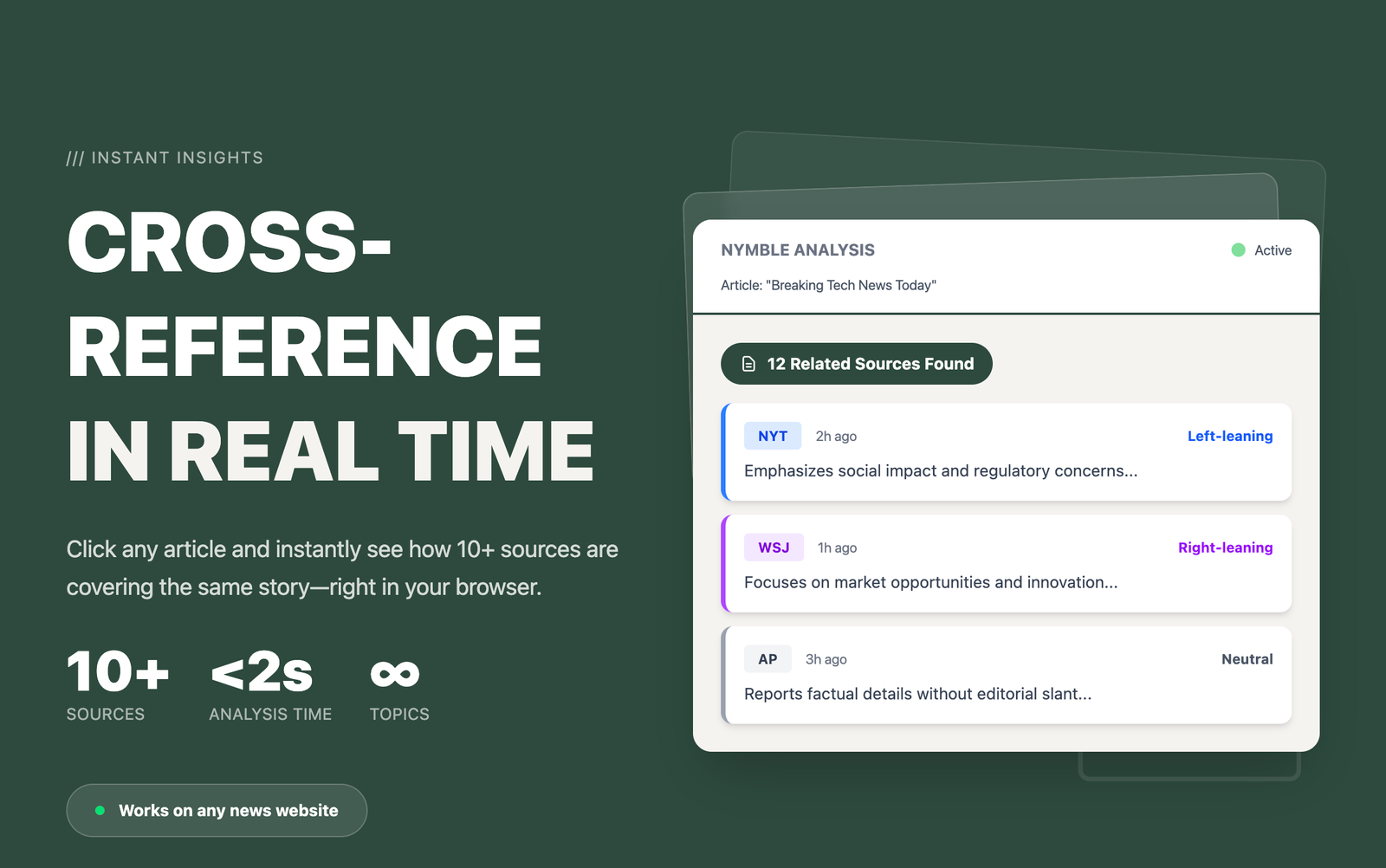 Descrição da ferramenta: Nymble é uma ferramenta de navegador que agiliza pesquisas, permitindo a comparação instantânea de fontes e a análise de diferentes relatos, tudo sem sair da aba atual.