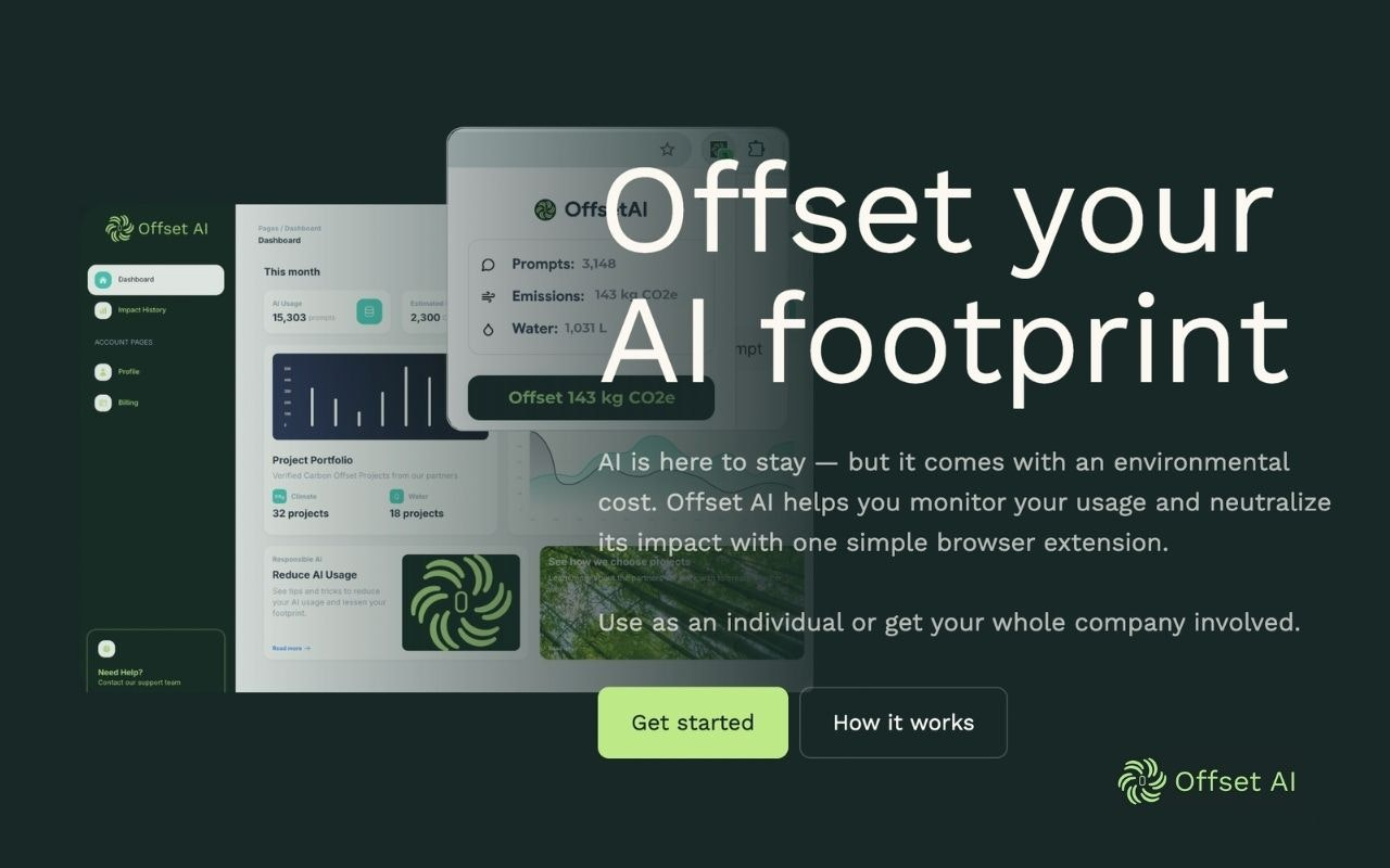 Descrição da ferramenta: Offset AI é uma extensão de navegador que permite monitorar e neutralizar o impacto ambiental do uso de inteligência artificial, promovendo ações sustentáveis tanto individualmente quanto em equipe.