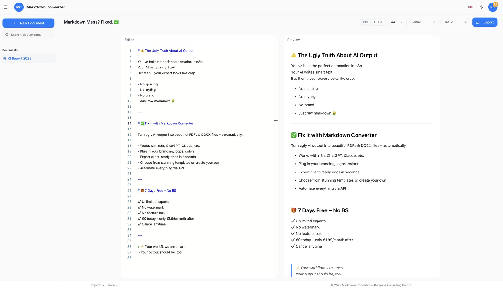 Descrição da ferramenta: Ferramenta online gratuita que converte documentos Markdown em PDF, DOCX ou Google Docs, mantendo a formatação, permitindo templates personalizados e integração com API, n8n e MCP para automação de criação de documentos.