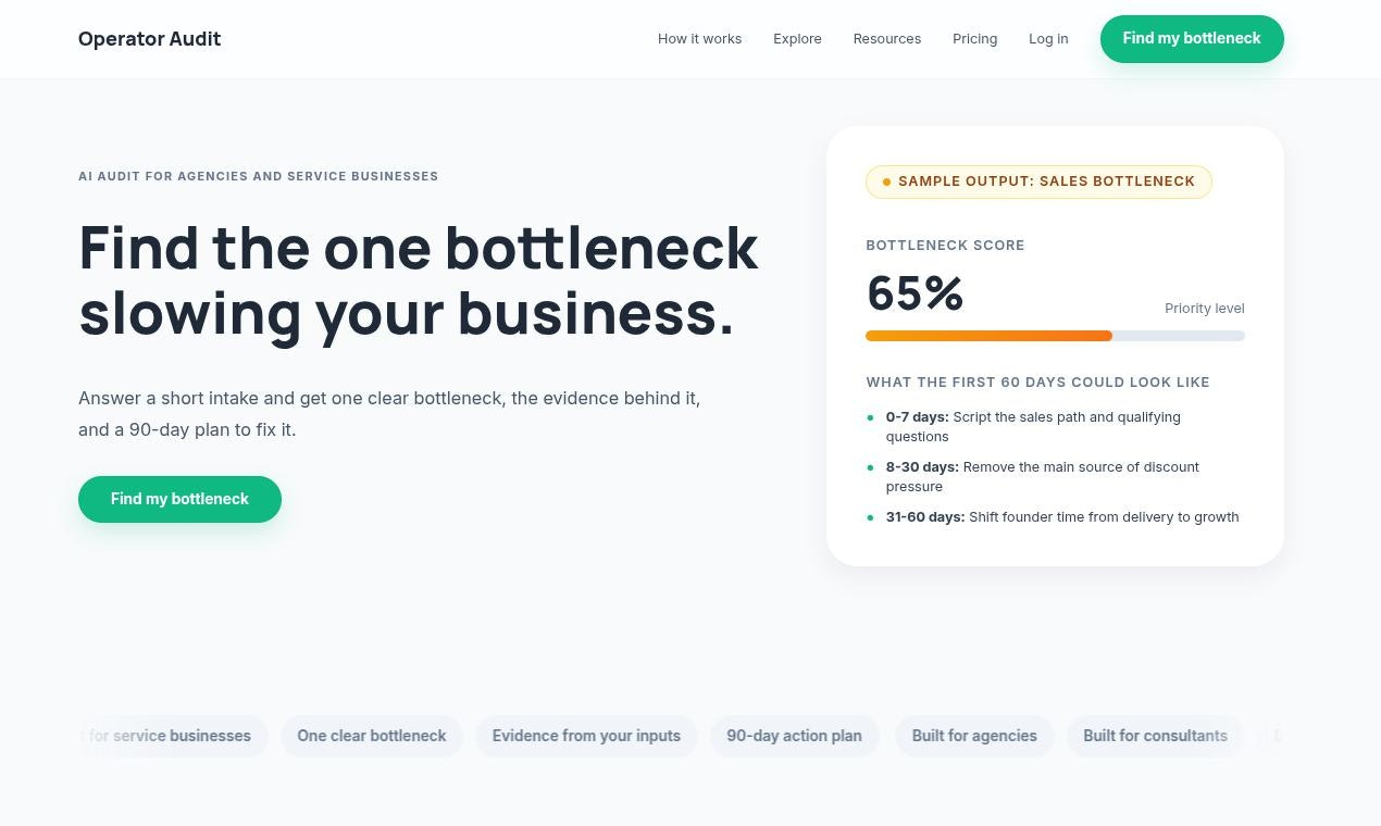 Operator Audit identifica os principais gargalos operacionais de uma empresa, oferecendo um plano de ação de 90 dias com diagnóstico, metas de KPI e etapas específicas para otimizar o desempenho do negócio.
