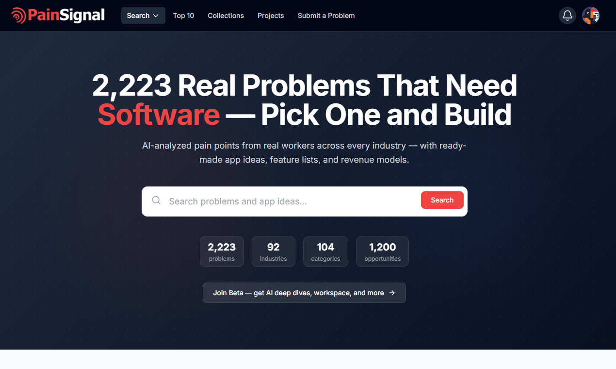 Descrição da ferramenta: Pain Signal é uma plataforma que analisa milhares de postagens de trabalhadores em diversas indústrias, identificando suas frustrações por meio de inteligência artificial e transformando esses insights em ideias de aplicativos validados, com recursos, público-alvo e modelo de receita.