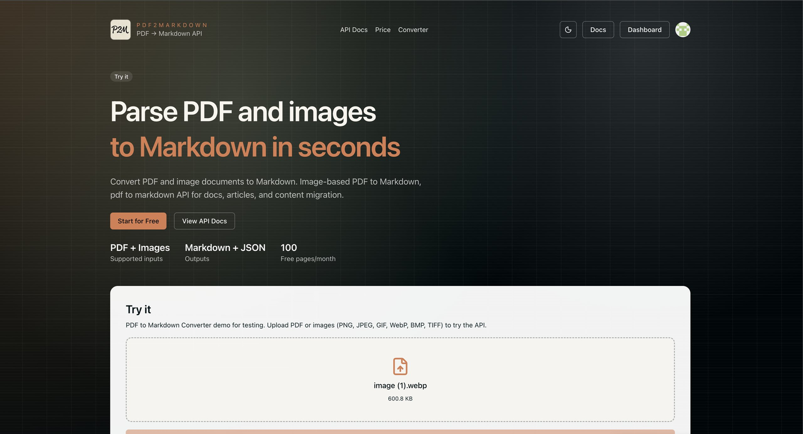 Descrição da ferramenta: PDF2Markdown é uma ferramenta que converte documentos PDF e imagens em Markdown limpo, oferecendo suporte a textos e PDFs escaneados, com APIs REST, SDKs oficiais e integração com agentes de IA para facilitar a migração de conteúdo.