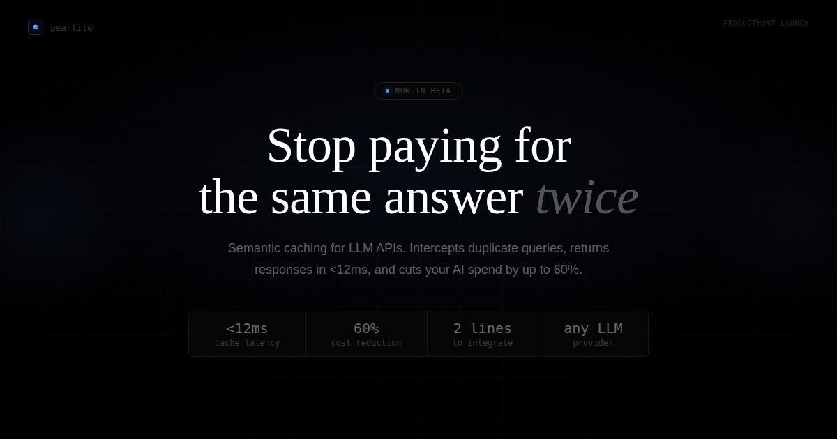 Descrição da ferramenta: Pearlite é uma ferramenta que intercepta consultas semânticas semelhantes a APIs de LLM, retornando respostas em menos de 12ms e reduzindo custos de até 60% ao evitar chamadas redundantes.