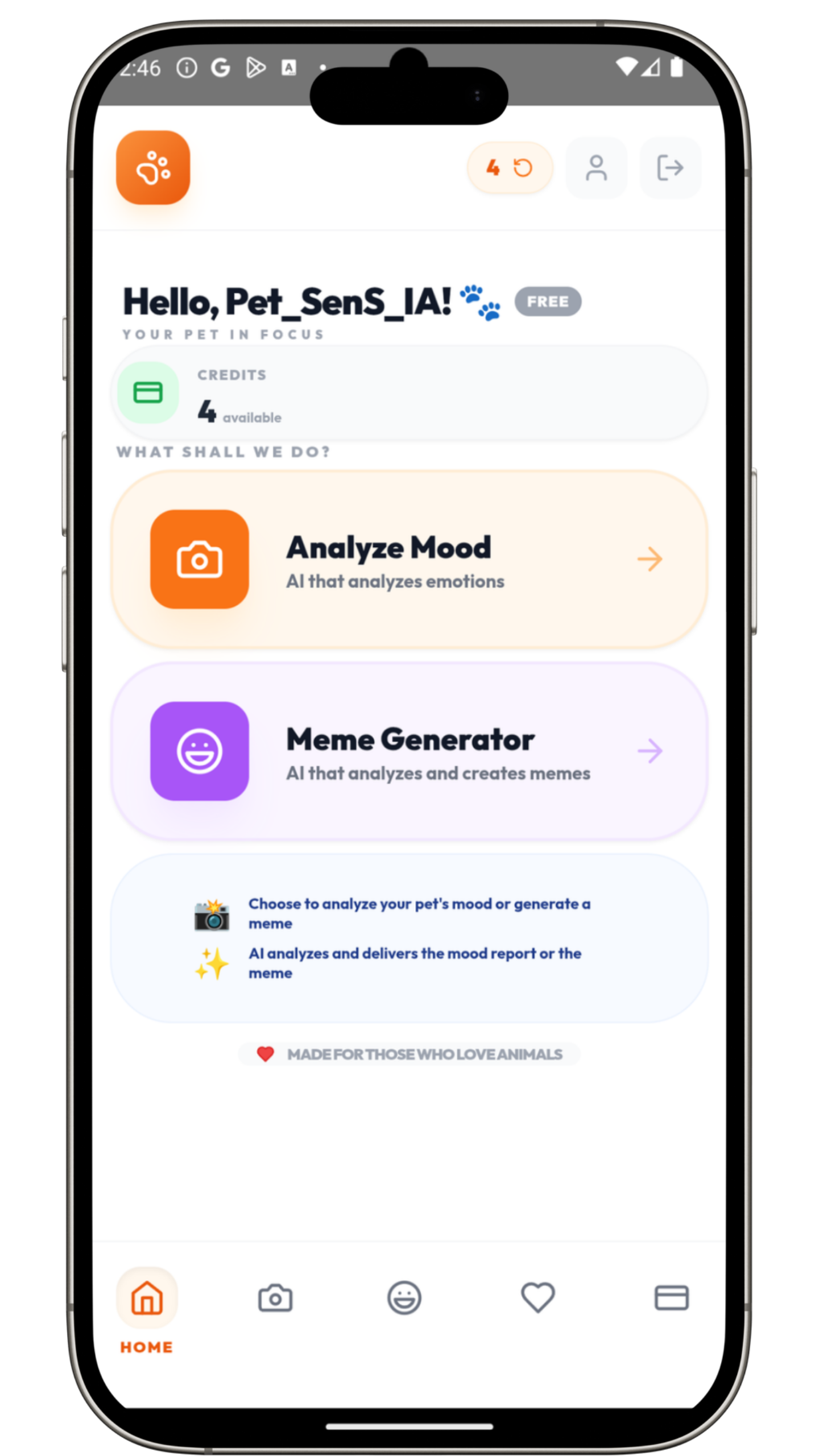 🧠 Análise de Humor: Interpreta o estado emocional do pet através de fotos, auxiliando no entendimento do bem-estar animal.