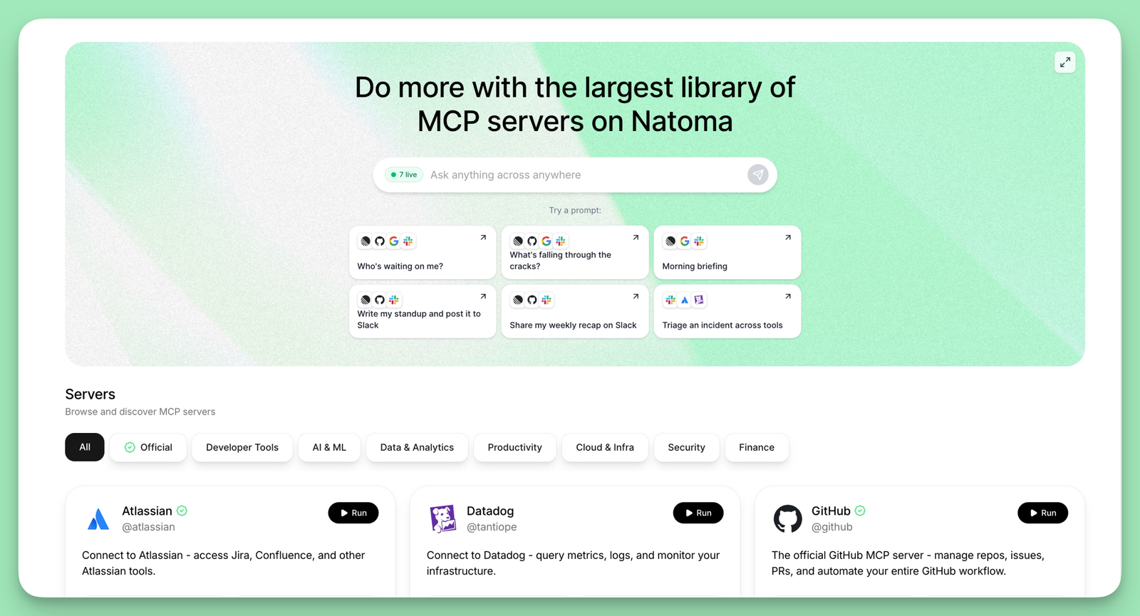 Descrição da ferramenta: Playground by Natoma é um diretório interativo gratuito para servidores MCP, permitindo explorar, testar e inspecionar mais de 100 servidores verificados de forma rápida e sem necessidade de configuração ou cadastro.
