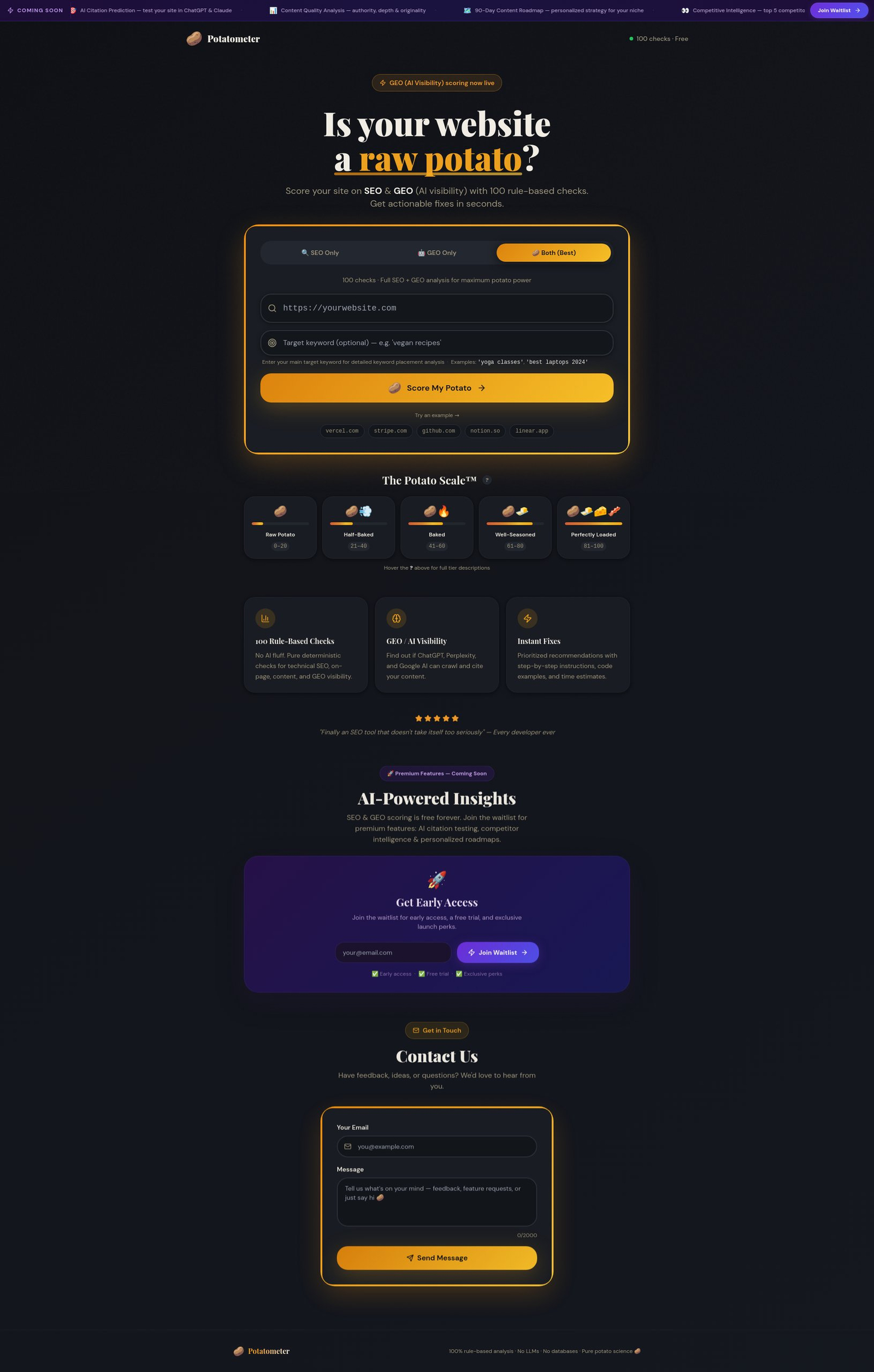 Descrição da ferramenta: Potatometer avalia a visibilidade do seu site em SEO e IA (GEO) por meio de 100 verificações baseadas em regras, fornecendo análises precisas e recomendações detalhadas para melhorias rápidas e eficazes.